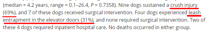 실제로 경험적으로 지금까지 봐온 엘리베이터 사고 환자들은 대부분 강아지가 엘리베이터내부로 혹은 외부로 이동하지 않았는데 문이 닫히면서 따라 올라가다 줄이 끊어져 발생한 낙상 사고들이었고 꼬리나 목이 낀 사례는 거의 없었다.