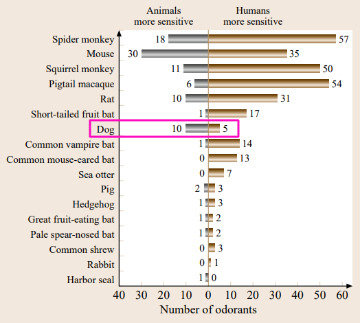 규격화된 취기제 중 개가 더 민감하게 반응하는 종류가 사람에 비해 훨씬 많다.