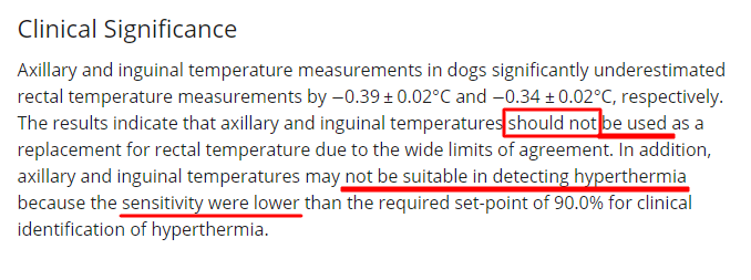 또한 민감도가 낮아서 고열을 놓치는 경우도 생기기에 반드시 직장 체온 측정을 해야 한다는 근거가 된다.