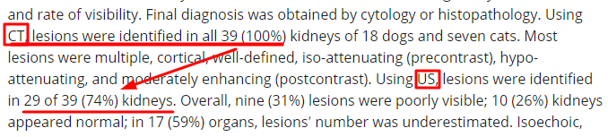 개와 고양이의 신장에 존재하는 결절성 병변의 유/무를 평가하는데에 있어 CT와 복부 초음파 검사는 얼마나 차이가 발생하는지에 대한 논문이다.