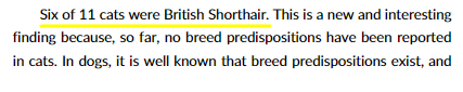 진단된 환자에서 브리티쉬 숏헤어가 많았다는 지점이다. 하지만 섬나라인 대한민국에 100% 수입인 품종은 수입업자의 수입 대상에 따라 달라질 수 있기 때문에 절대적이라 이야기할 수는 없을 것이다.