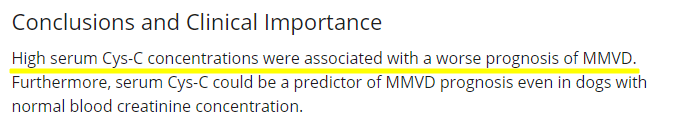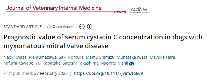 혈중 cystatin C 농도와 국내 소형견에서 가장 많은 심장질환인 myxomatous mitral valve disease 의 예후사이 관계를 평가한 논문이다.