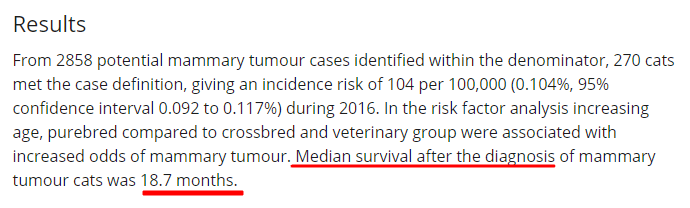 고양이 유선종양의 생존기간, 중위생존기간은 18.7개월로 나타났다.