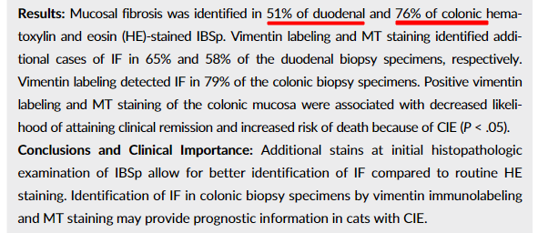 조직학적 논문이기 때문에 세부 사항에 대해서는 학문적 관심으로 참고하면 될것이고 중요한것은 만성 염증성 장질환이 잇는 고양이의 십이지장에서 51%, 대장에서 76%에서 장의 섬유화가 관찰되었다는것이다.