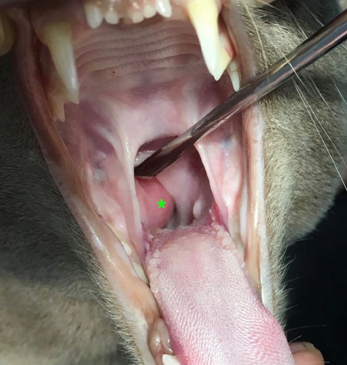 마취를 하고 입을 벌려 확인되는 종괴가 인후두에서 관찰되었다고 한다.