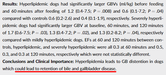 고지혈증이 있는 강아지를 키운다면 담낭 파열의 가능성을 열어두고 고지혈증의 원인에 따라 치료 방향을 결정해야 할듯 하다.