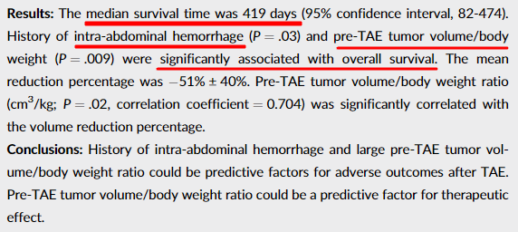 복강내 출혈이 있는 경우 생존상이 낮고, 종양의 크기가 원래 매우 컸다면 예후가 불량하다는 결과를 보여준다.
