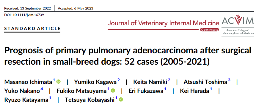 원발성 폐종양이 생긴 52마리의 개에서 수술 전 종양의 크기와 생존 기간에 대해 조사한 논문이다.