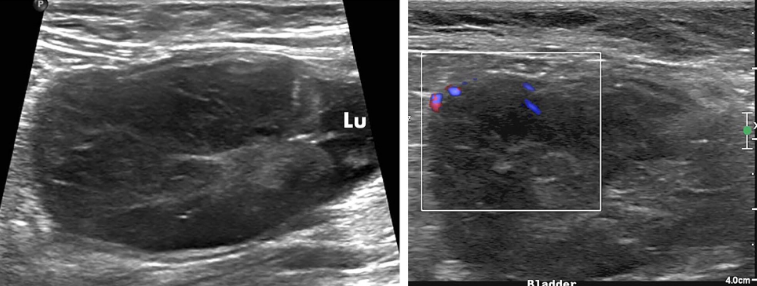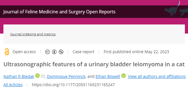 고양이에서 보기 드문 육종이 방광에 생겼을때 보일 수 있는 초음파 소견을 소개하는 논문.