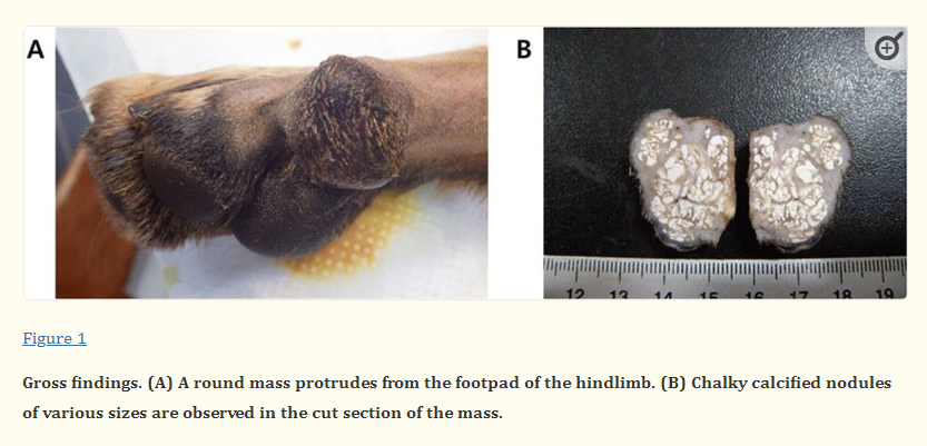 개나 고양이에서는 피부 뿐 아니라 내부 근육에서도 비교적 다발하는 병변이기 때문에 cuti가 빠지면서 국한성석회화증으로 불리운다.