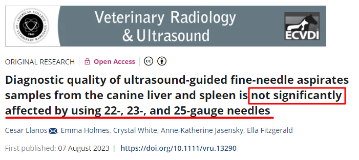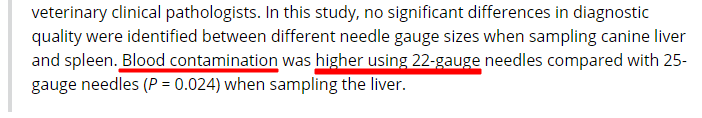그렇다고 25G를 사용하기에 일반적인 국내 동물병원에는 25G 니들이 별로 사용되지 않고 주로 공급되는 25G는 길이가 짧아 심부의 간을 FNA를 하기에 부정적이다.