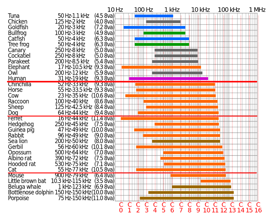 표에서와 같이 가청 음역대로보자면 인간과 큰 차이가 있지 않고 약간 더 넓은 정도, 고양이도 유사하나 고양이가 강아지보다 더 넓다.