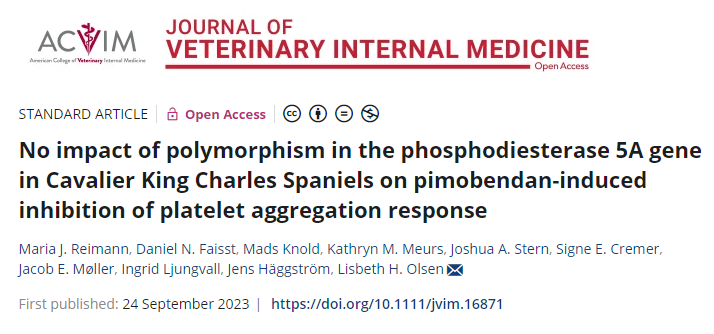카바리어 킹 찰스 스파니엘에서 나타날 수 있는 유전자인 phosphodiesterase 5A gene (PDE 5A gene)에 의해 대표적인 PDE5 차단제인 pimobendan의 작용 중 혈소판 응집 억제는 정상적으로 작용하는가에 대한 논문이 나왔다. 결론을 제목에 작성해 둘 정도로 강하게 어필하고자 하는 주제다.