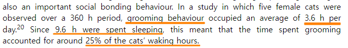 360시간동안 5마리의 암컷 고양이를 관찰하여 평균 하루 3.6시간동안 그루밍을 하였다는 결론을 얻었다고 한다.