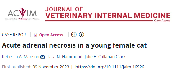 고양이에서 부신계 질환은 매우 드문 질환에 해당하여 보통 언급도 잘 되지 않는 게 일반적이다. 그렇다고 발생을 전혀 하지 않는 것은 아니기 때문에 배제하여서는 안 되는 장기이기도 하다. 이번에 보고된 증례는 마취 후 발생한 것으로 추정되는 급성 허혈성 부신괴사증으로 이차적인 에디슨병이 유발된 젊은 고양이 증례이니 참고하기 바람.