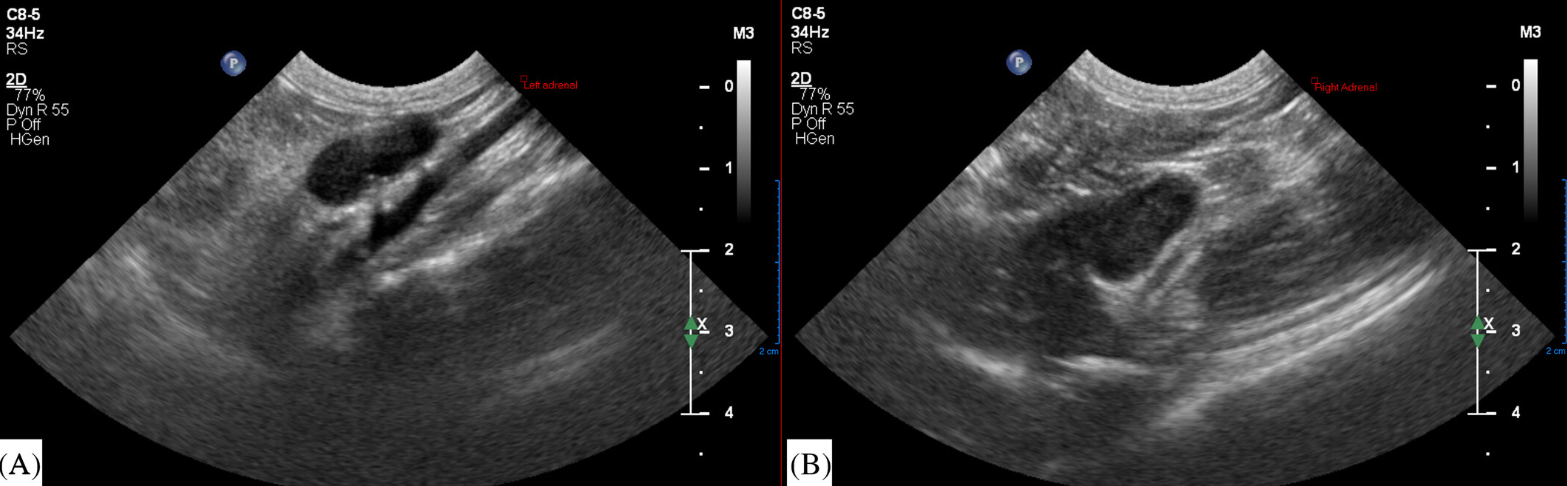 특히 주목할 소견은 초음파 소견인데 addison's disease를 언급하면 부신의 크기 감소가 반사적으로 나타나지만 이번 증례는 급성 부신괴사인만큼 염증으로 인한 부종으로 부신의 크기가 정상보다 더 커지는 것을 볼 수 있다. 또한 부종으로 인하여 에코의 감소 양상과 주변부 에코 상승을 동반하고 있는 특징을 볼 수 있다.