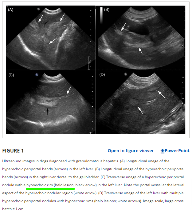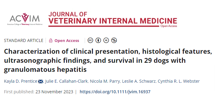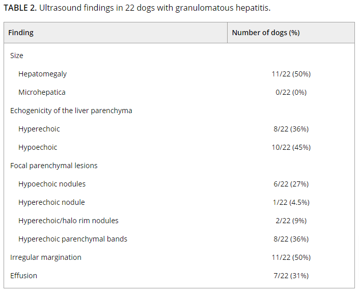 그리 자주 보이는 환자는 아니지만 육아종성 간염은 개에서 관찰되는 질환 중 하나이다. 비특이적인 초음파 소견으로 인하여 간과하기 쉽고 대증요법에 반응을 잘하여 예후가 좋은 편에 속하는 질환이기 때문에 잘 잊히는 그런 질환이기에 논문이 나왔을 때마다 환기를 해야 실제 케이스와 접했을 때 감별진단 리스트에 넣을 수 있어 소개한다.
