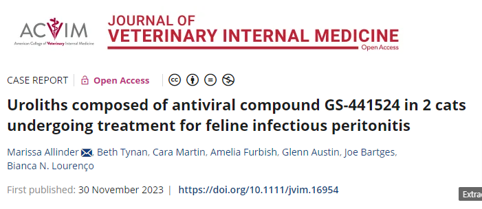 순도 98%의 GS-441524 로 구성된 결석이 발생한다는 것. 요로계 폐색까지 유발된 증례를 가지고 보고를 했으니 폐색 없이 발생한 증례도 상당할 것으로 예상된다.