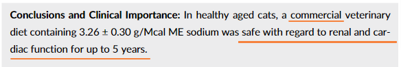 결론적으로 상업적으로 생산된 고 나트륨 사료는 건강했던 고양이에서 신장과 심장에 아무런 영향을 끼치지 않았다는 것이다.
