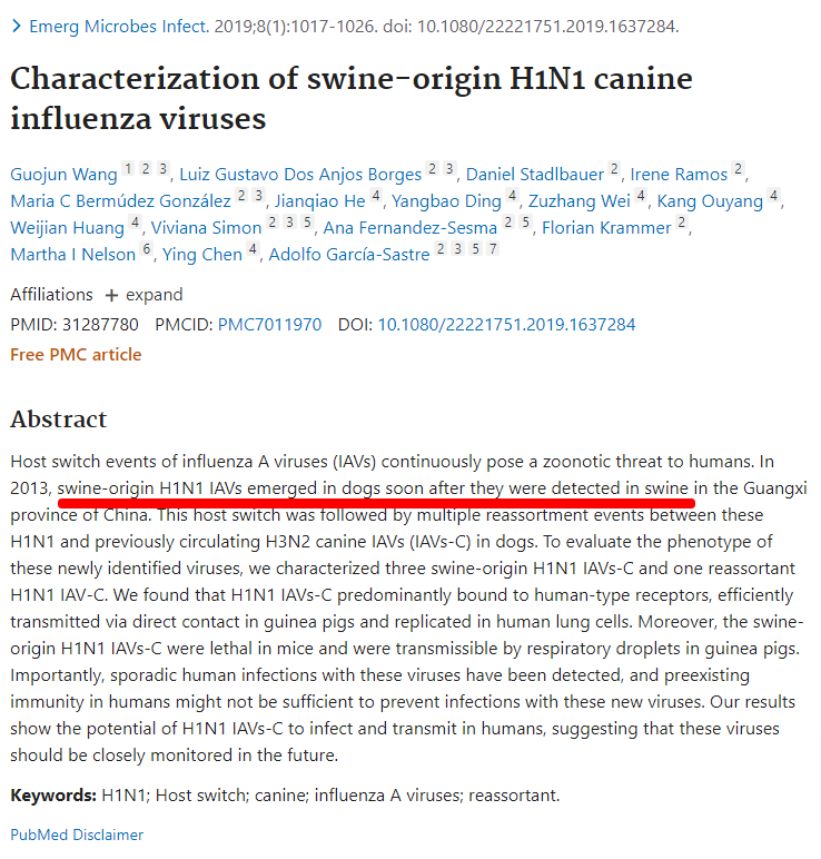 중국에서 돼지에서 H1N1인 A형 독감이 발견된 이후 그곳의 개에서도 바이러스가 검출되어 개에게 감염될 수 있음을 보여주었다.