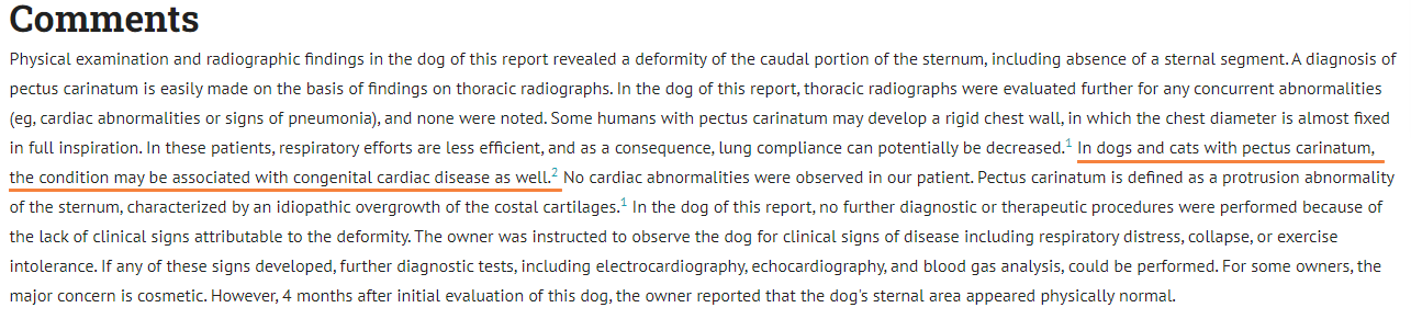 즉, 새가슴(pectus carinatum)이 있는 경우 사람과는 달리 선천성 심장질환과 연관되어 있다는 언급. HCM이나 DCM을 말하는 것.
