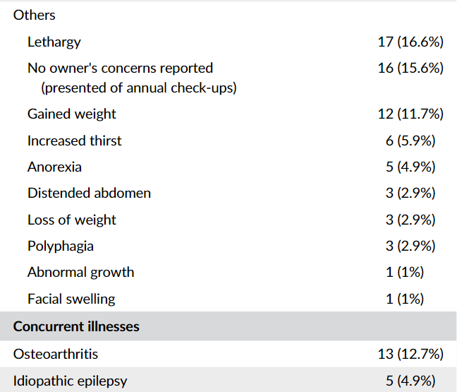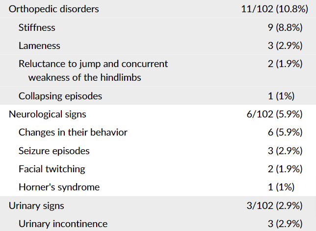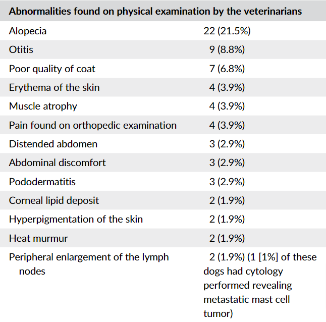 수의사들이 신체 검사로 발견하는 이상증상은 다음과 같다.