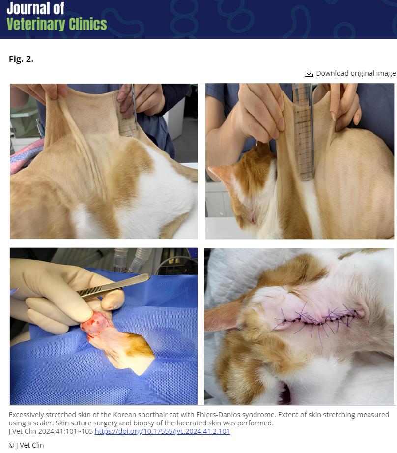 고양이 엘러 단로스 증후군 (Ehlers-Danlos Syndrome) 증례가 코숏에서 진단되었다. 즉, 한국에 없는 질환이 아니니 증상이 있는 환자를 만나면 배제말고 진단에 이용할것.