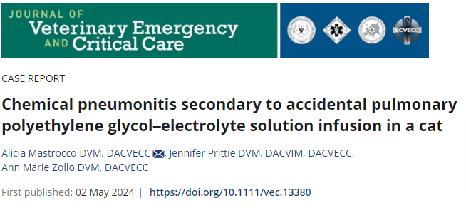 이번에 볼 증례는 고양이에서 발생한 폴리에틸렌글리콜-전해질 용액(PEG-ELS)의 폐 내 주입으로 인한 화학적 폐렴과 급성 호흡곤란 증후군 치험례에 대해 소개하는 논문입니다.