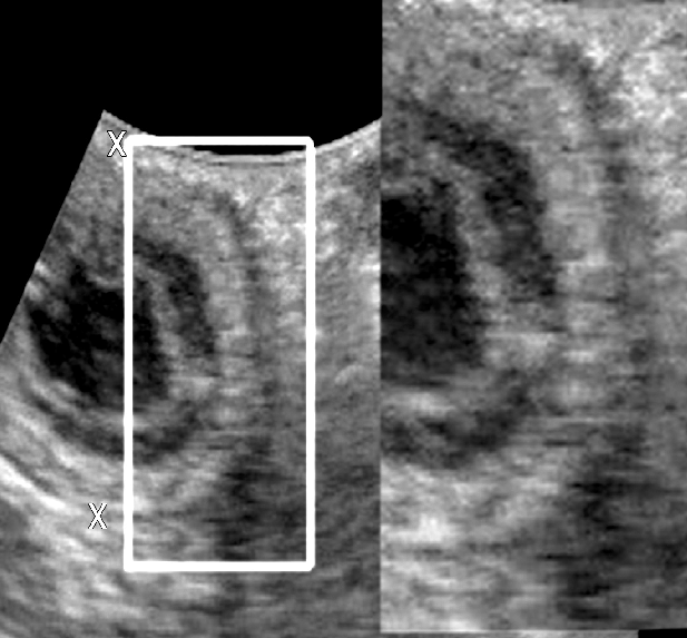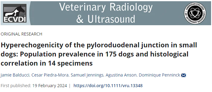 사진처럼 개의 복부 초음파 검사에서 위십이지장 연접부, 소위 PDJ에 해당하는 부분에 에코가 높게 관찰되는 경우는 흔하게 관찰되어 실제 임상적인 의미를 두지 않는데 이에 대한 명확한 문헌적 근거가 나와 소개한다.