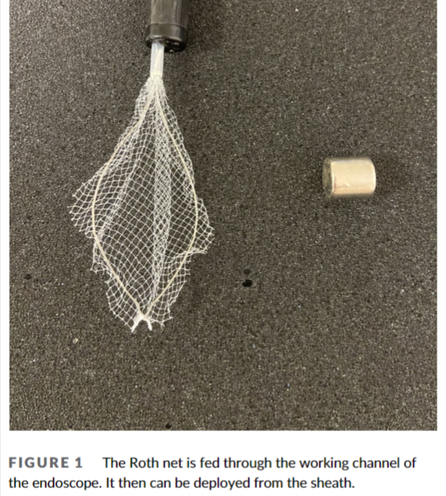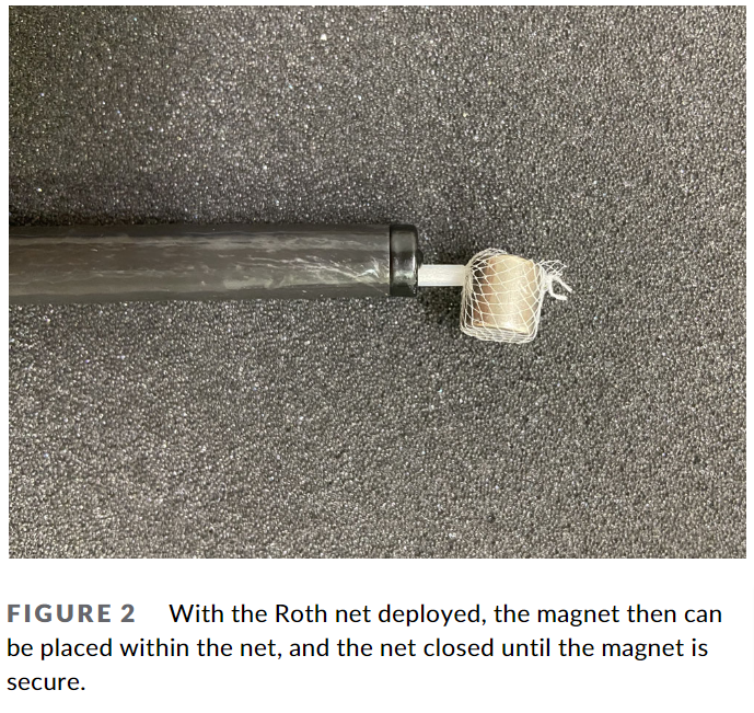 이 상태 대로 넣어서 자석에 붙여서 이물을 꺼내는 것. 예전에는 이렇게 내시경에 다른 device를 달아 넣으면 비인두, 식도에 손상을 줄 수 있다고 하여 추천하지 않았다. 저자들의 경험 공유로 충분히 응용할 수 있다는 근거 자료로 활용할 수 있게 되었다.
