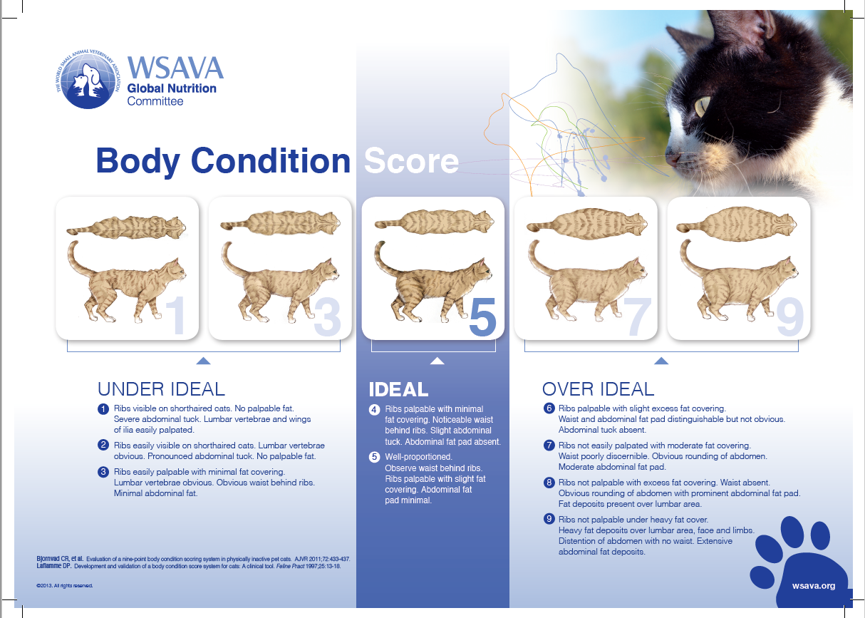 고양이의 체형 점수(Body Condition Score, BCS)는 고양이의 체형 상태를 평가하는 데 사용되는 도구입니다. 5단계 BCS 시스템은 각 단계에서 고양이의 체지방 비율과 체형을 구체적으로 설명합니다. 다음은 5단계 BCS 기준에 대한 자세한 설명입니다: