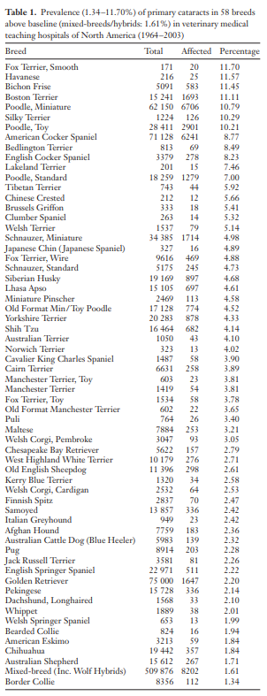 개의 품종별 백내장 유병률