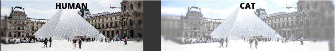 또한 고양이는 근접해 있는 사냥감에 대한 시력을 더 중요하게 진화하여 근시에 해당하여 풍경을 보게 되면 다음과 같이 보인다.